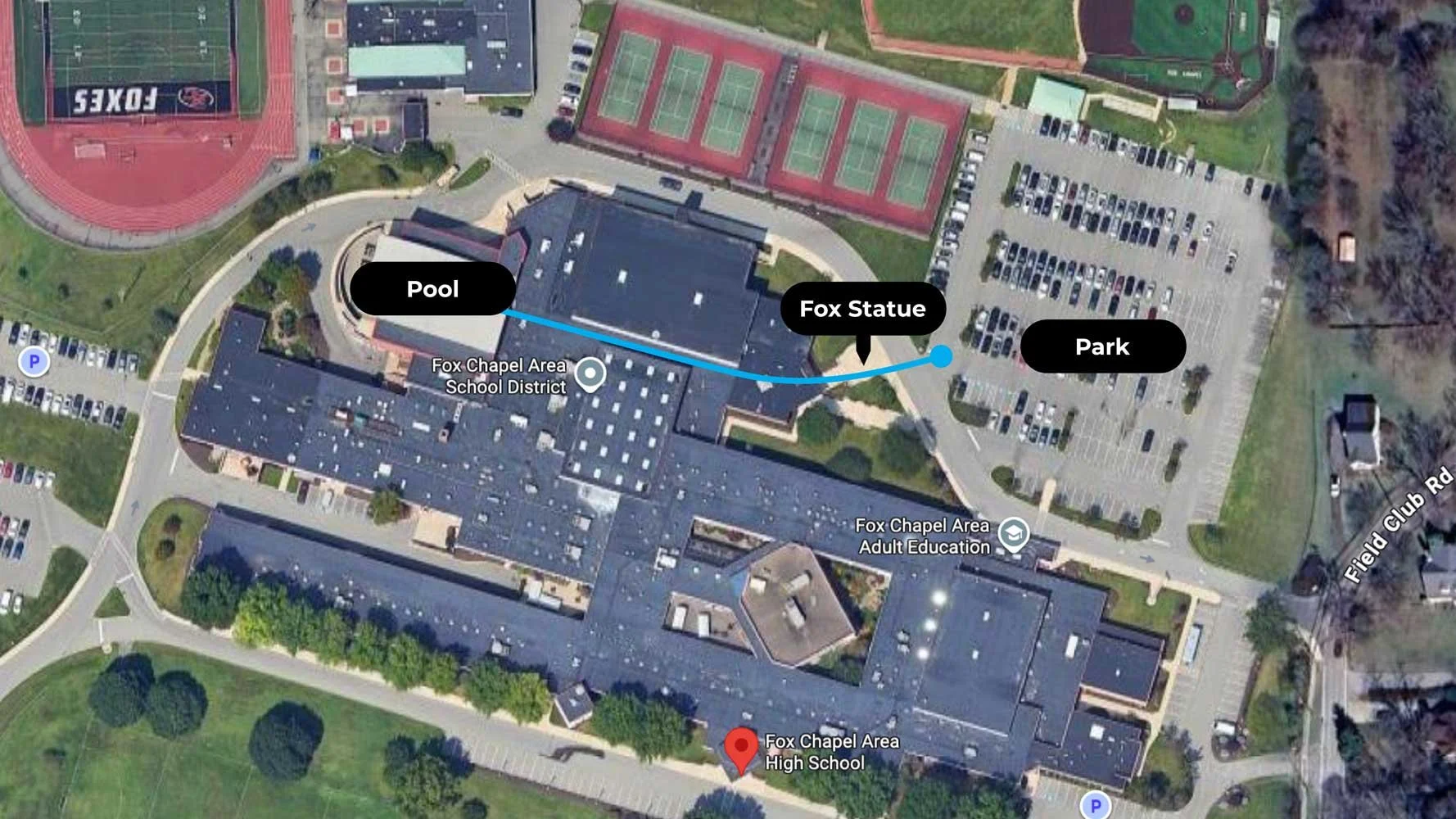 Our primary residence is the Fox Chapel High School where we are fortunate to swim in this 25-yard, 8-lane indoor pool. We enter through the “Fox” door at the rear of the school by the Fox Statue.